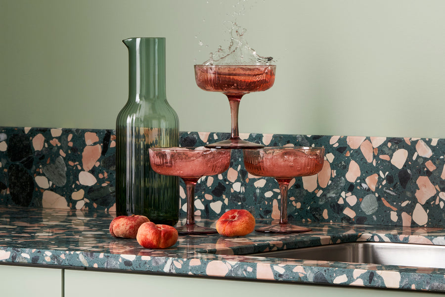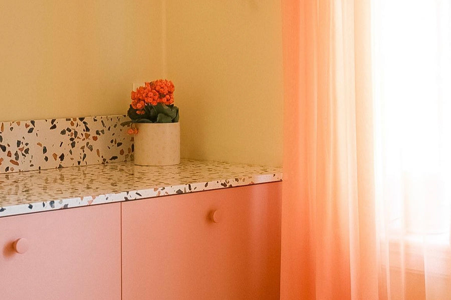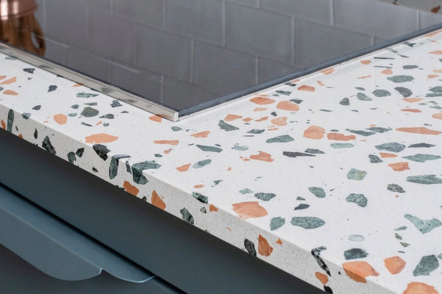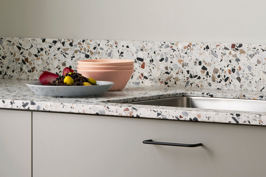 Our terrazzo is available in three designs, developed to harmonize with our faucets, handles and plastic-free lacquer paint for kitchen- and bathroom cabinets. You can also order custom made tops for tables and combine with our "Elephant" table legs in matching colours. We manufacture, deliver and assemble terrazzo according to your wishes. Email contact@toniton.com for a quote.
