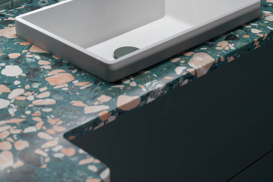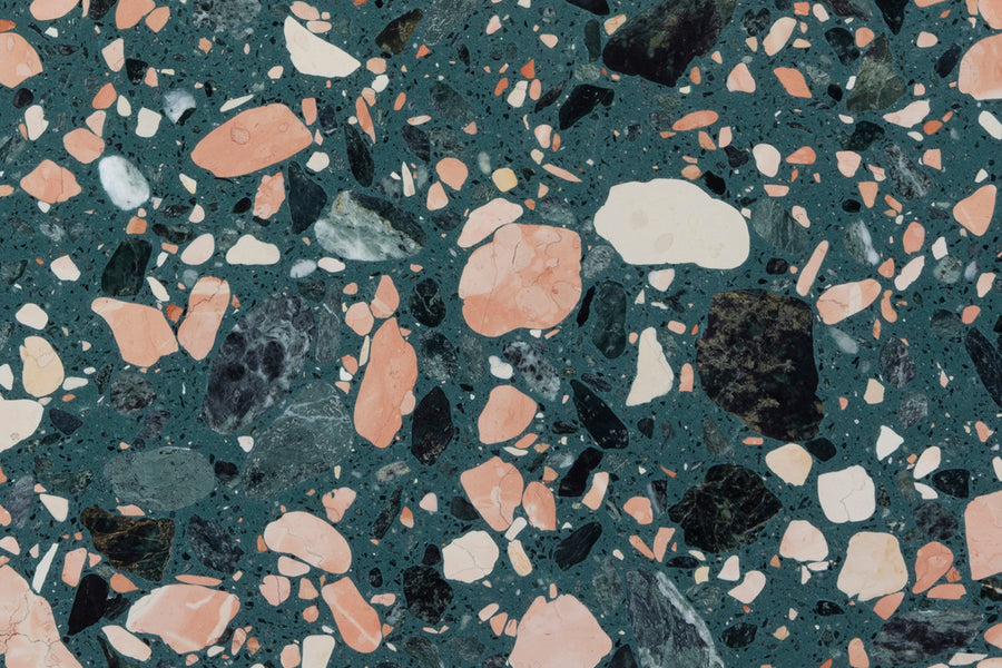 Like delicate confectionery! A multicolored terrazzo with a medium dark green tone in the base. Larger elements of stones in dark green, peach and creme. A durable resin-based premium terrazzo from Italy with a matte ground surface and a thickness of 20 or 30 mm. Email contact@toniton.com for a quote.