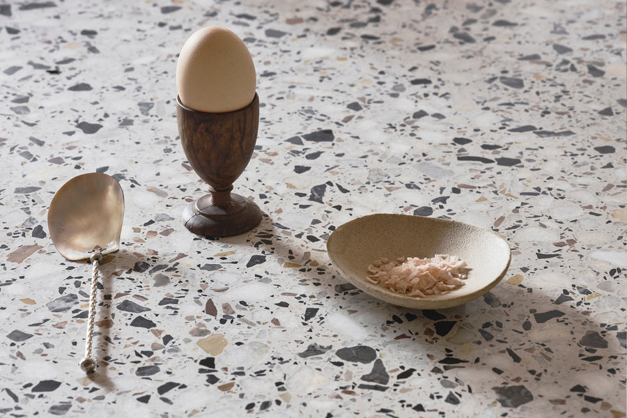 Like French nougat with a splash of sea. Toniton's creme terrazzo is a multi-colored terrazzo with a light creamy tone as a base. Medium-sized touches of blue-gray tones and amber-brown mottling. A durable resin-based premium terrazzo from Italy with a matte ground surface and a thickness of 20 or 30 mm. Email contact@toniton.com for a quote.